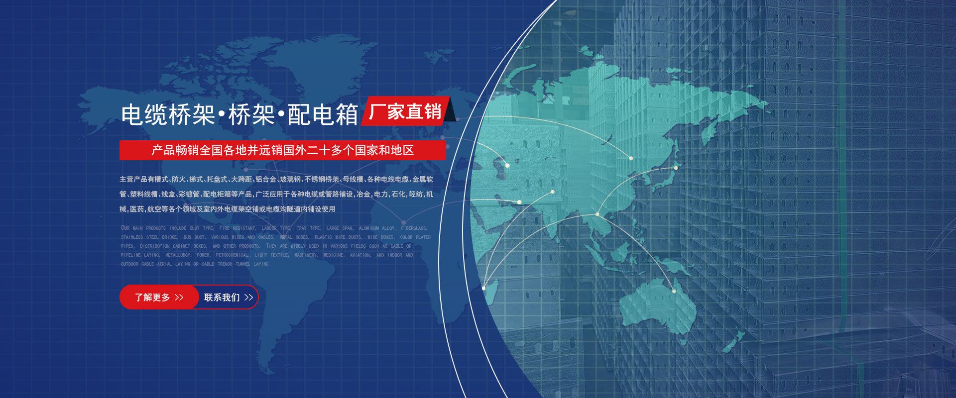 主營產品有槽式、防火、梯式、托盤式、大跨距、鋁合金、玻璃鋼、不銹鋼橋架、母線槽、各種電線電纜、金屬軟管、塑料線槽、線盒、彩鍍管、配電柜箱等產品,款式多樣,結構新穎,連接牢靠,強度密封性好,產品暢銷全國各地,遠銷國外二十多個國家和地工,深受國內外用戶的好評,竭誠歡迎海內外朋友蒞臨合作
